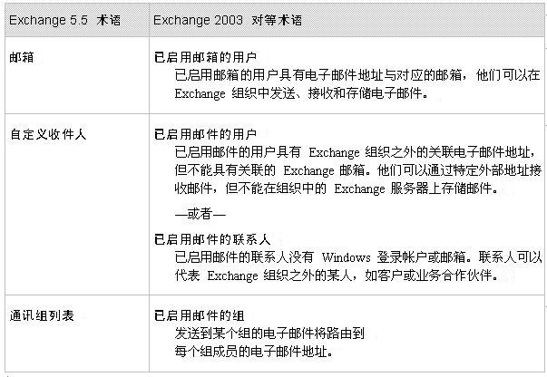 Exchange 2003 中的 Exchange 对象不同于 Exchange 5.5 中的 Exchange 对象。请确保您了解这些对象的不同之处。表 4.6 列出了 Exchange 5.5 中的 Exchange 对象以及 Exchange 2003 中与其关联的对等对象。