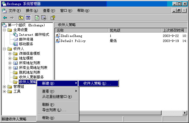 要开始创建收件人策略,请在 Exchange 系统管理器中用鼠标右键单击"收件人策略"容器,指向"新建",然后单击"收件人策略"(见图 4.8)。
