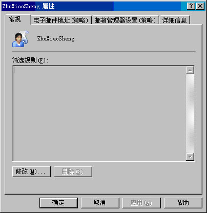 最初,没有任何筛选器规则应用于策略(见图 4.10)。如果不创建筛选器,策略将不会应用于任何收件人。要使用 LDAP 查询创建筛选器,请单击"常规"选项卡上的"修改"。