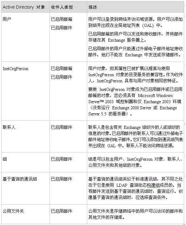 虽然邮件的接收方是人,但是"收件人"一词指的是 Microsoft Active Directory? 目录服务对象,而不是人。收件人是具有邮件能力的 Active Directory 对象。但是,对象本身并不接收邮件。邮件并不存储在 Active Directory 中,但它们可以驻留在 Exchange 服务器上的邮箱、公用文件夹或另一个邮件系统中。