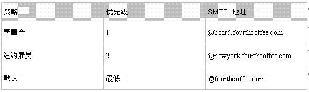 Fourth Coffee 的 Exchange 管理员希望为组织中的收件人创建三个电子邮件地址。第一个用于董事会,第二个用于在纽约工作的公司雇员,第三个用于公司本部办公室的其他雇员。他创建了如表 4.2 所示的三个收件人策略。