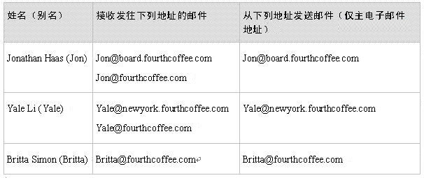 请注意,Jonathan Haas 在纽约办事处,尚无 <alias>@newyork.fourthcoffee.com 地址。要具有此辅地址,有必要将它包括在应用于他的收件人策略中。但是,应用于 Jonathan 的策略中具有较高优先级的策略是"董事会"策略。由于董事会成员都工作在不同的州,因此策略不包括 <alias>@newyork.fourthcoffee.com。要将 <alias>@newyork.fourthcoffee.com 添加到 Jonathan 中,可以在 Active Directory 用户和计算机中手动添加辅地址,或者,通过编程的方法将 <alias>@newyork.fourthcoffee.com 作为辅地址添加给纽约办事处的所有雇员。