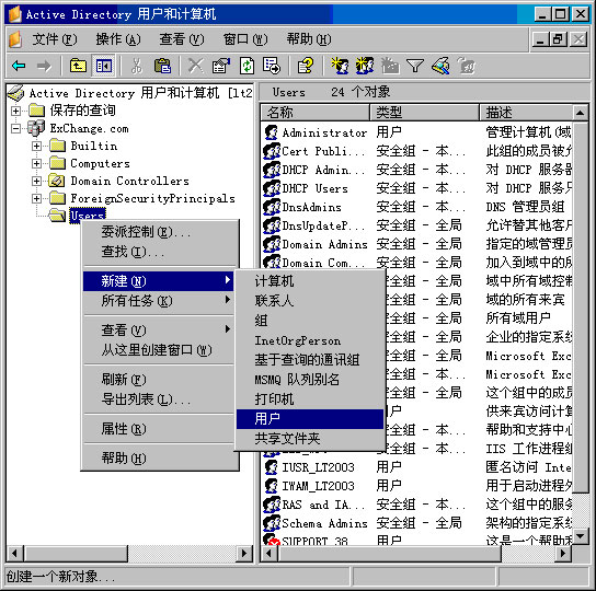 若要创建已启用邮件或已启用邮箱的新 Active Directory 对象,请使用 Active Directory 用户和计算机(见图 4.3)。