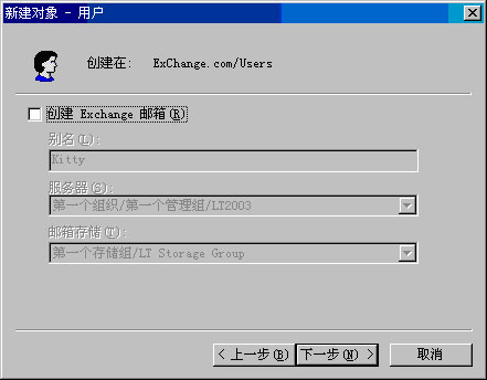 在已安装 Exchange 的网络中创建收件人对象时,该收件人将默认为已启用邮箱或已启用邮件的对象。如果不希望使该 Active Directory 对象成为已启用邮件或已启用邮箱的对象,应清除"创建 Exchange 邮箱"复选框(如图 4.4 所示)。