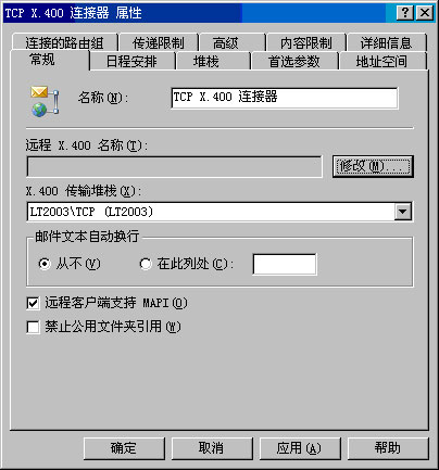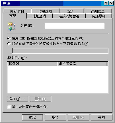考虑这些问题后,应通过设置"路由组连接器属性"对话框的"常规"选项卡中的配置选项来回答前四个问题。最后一个问题可以通过在"远程桥头"选项卡上指定远程桥头服务器来回答。