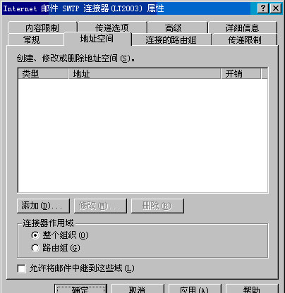 地址空间用于定义您希望通过连接器路由的电子邮件的邮件地址或域。例如,地址空间 *(星号)囊括了所有外部域。具有此地址空间的连接器能够路由所有外部电子邮件。