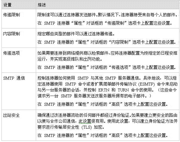 SMTP 连接器用于指定邮件的独立路由。可以使用 SMTP 连接器建立 Internet 邮件的网关,或者连接到特定的域或邮件系统。连接器有助于您为指定的邮件路由指定具体的选项。