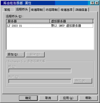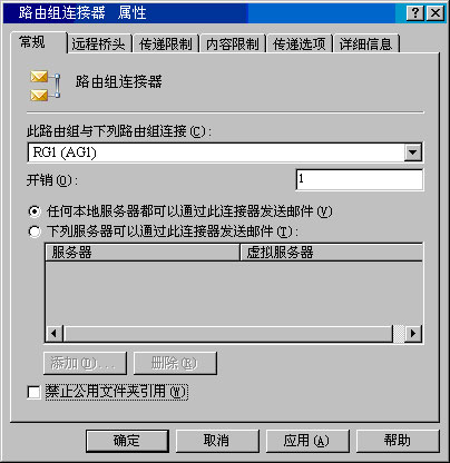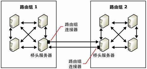 默认情况下,路由组中的所有服务器都可以通过路由组连接器发送邮件。能够通过路由组连接器发送邮件的服务器是"桥头服务器"。每个桥头服务器都是 SMTP 虚拟服务器和 Exchange 服务器的组合,并负责通过连接器传递所有邮件。
