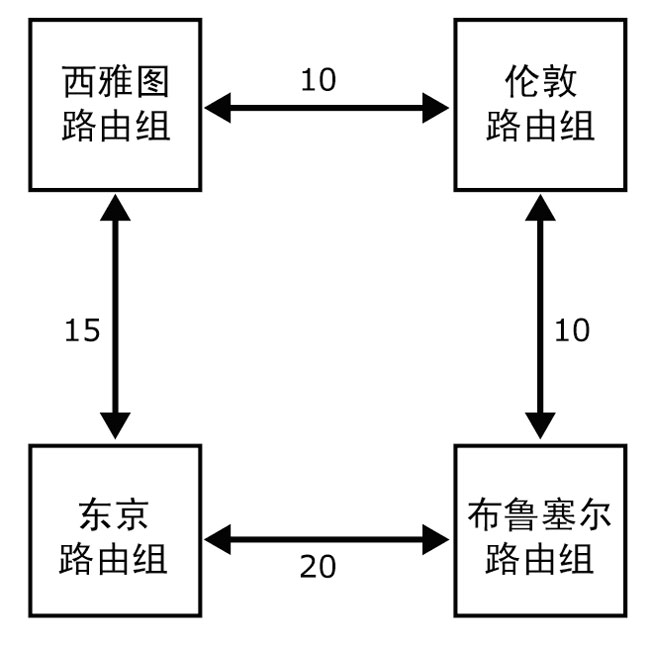 要了解链路状态信息和连接器开销的工作原理,请考虑图 5.2 所示的路由拓扑(其中存在四个路由组):西雅图、布鲁塞尔、伦敦和东京。每个路由组之间都存在连接器,并且基于网络速度和可用带宽为其分配了开销。