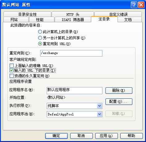要完成OWA的URL的简化需要使用IIS。在IIS中打开默认网站的属性窗口。然后.单击“主目录”选项卡,选择“重定向到 URL”选项。在“重定向到”中,键入“/exchange”,并且选中“输入的URL下的目录”,然后单击“确定”即可(图2)。