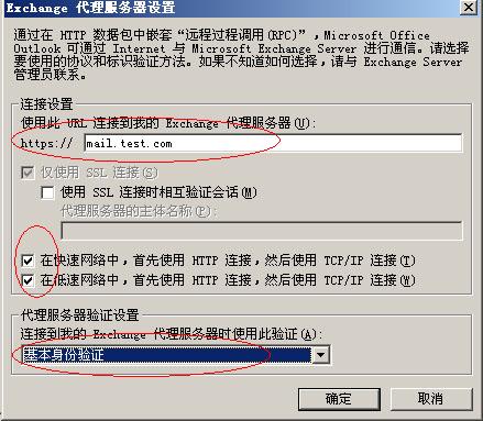 1. 在该界面的Exchange代理服务器https://中输入“mail.test.com”(此处为RPC代理服务器,在我的实验环境中为前端mail.test.com),同时对“在快速网络中,首先使用HTTP连接,然后使用TPC/IP连接”和“在低速网络中,首先使用HTTP连接,然后使用TPC/IP连接”进行勾选,在“代理服务器验证设置”中,选择“基本身份验证”,确定后退出。