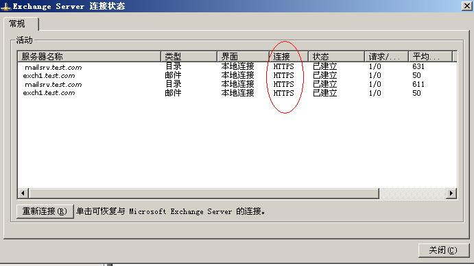 在运行中输入outlook /rpcdiag,回车,选择刚才建立的配置文件,然后输入用户名和密码,如果在网络连接框中显示了HTTPS的信息,则说明配置完全正确。