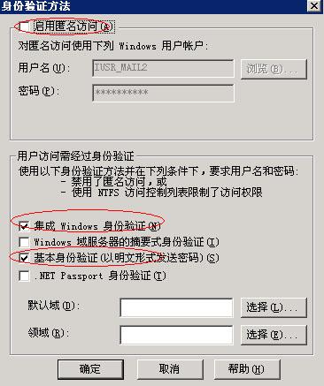 在身份验证方法对话框中,去掉“启用匿名访问”选项的勾,选择”集成Windows身份验证”和”基本身份验证”选项。关闭所有对话框。
