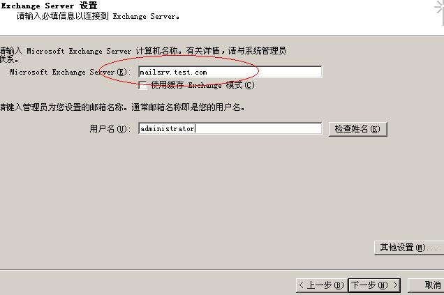 输入服务器名称(注意,此处是后端服务器的名称,在我的实验环境中,应该输入mailsrv.test.com)和用户名称,取消”使用缓存Exchange模式”选项,然后点击右下角的”其它设置”,如果出现不能解析名称错误,点击“取消”忽略。(此解析过程时间可能会很长)