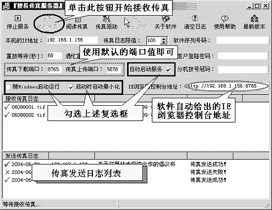 果冻提示 我们可以让服务器端的搜易传真服务器软件一启动便进入传真接收状态,这样便不会错过重要的传真了。在软件主界面上勾选“随Windows启动”、“启动时自动最小化”、“自动启动服务”等选项,这样每天一开机传真服务器便会开始工作。当然,前提条件是调制解调器要保持电源接通状态。