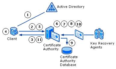 1)CA的证书管理员从CA的数据库里定位并找回用户的加密的私钥。这个加密的BLOB是被ACL保护的,以确保只有证书管理员能从数据库里COPY它。自从它被KRA的公钥加密后,证书管理员就不能导出用户私钥但可以从CA数据库里找回。这个加密的BLOB里包含着证书的发行者和KRA的证书序列号,证书管理员可以借助此序列号把找回的证书交给合适的KRA来解密。
