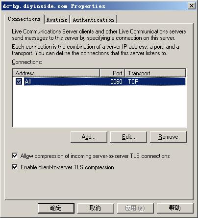 Live Communication Server客户端之间,以及服务器之间是通过指定的连接传送信息的,指定的连接包括IP地址、端口号和协议。如图12所示,服务器使用5060的TCP断口,监听所有通过此端口通讯的IP地址。要添加连接,单击“Add…”并指定IP地址,传输方法和端口。