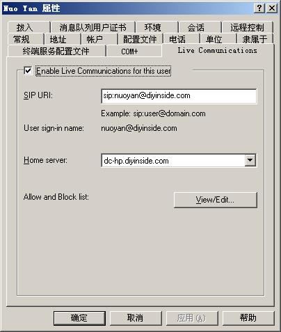 回到Active Directory Users and Computers管理控制台,打开刚才开启了Live Communication的功能的用户属性,您会发现“Live Communications”选项卡,在这个选项卡中,随时可以修改用户的SIP URI,登陆名,以及所使用的Live Communication主服务器,如图15。这个属性窗口也可在Live Communication Server管理控制台的Servers\Users打开。