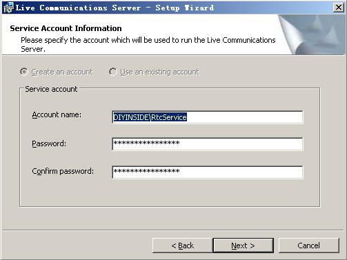 输入一个用来运行Live Communication Server的服务账号,包括账号名和密码,如图6。然后单击“下一步”。
