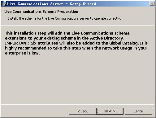 安装程序将会安装Live Communication Schema到活动目录,以及添加6条属性到全局目录中,如图8,单击“下一步”继续。