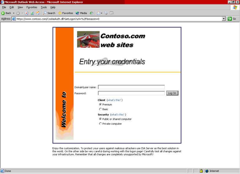 内容概述:在ISA Server 2004中,你可以自定义OWA用户的表单登录(FBA)页面。通过这篇文章,你可以学习到去如何实现。