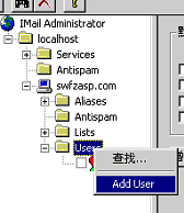 下面是如何来添加用户,选中邮局名,比如“swfzasp.com”,单击鼠标右键,在快捷菜单中执行“Add User”,