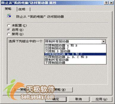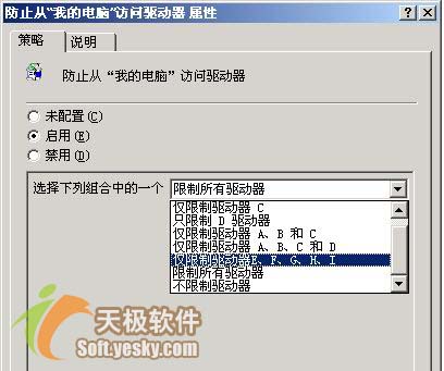 我们就是利用“防止从‘我的电脑”访问驱动器“来设置禁止usb接口。双击打开启用后,发现并不像我们想象的那样驱动盘符都存在,如图2所示: