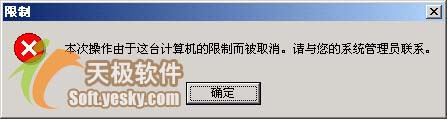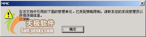到这里,其实封闭工作也做的的差不多了。假设还不放心,如果用户打开组策略,更改设置怎么办?那我们通过运行注册表,打开:[HKEY_CURRENT_USER\Software\Policies\Microsoft\MMC\{8FC0B734-A0E1-11D1-A7D3-0000F87571E3}]下的“Restrict_Run”的键值,改为“1”。当有的用户想运行组策略时,就出现了如下图7提示: