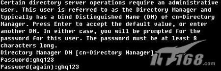 在这里Directory Manager DN采用缺省值,按回车键后,需要Password不小于8个字符,输入ghq12378,按回车键;再一次输入ghq12378口令,按回车键继续。