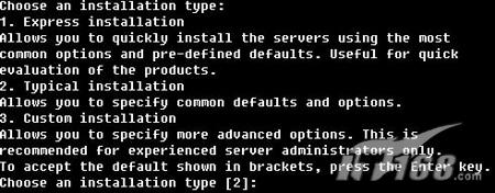 在上图4中,第一项是常规安装,这是一种快速安装方法,安装时使用公用的和预先定义好的缺省选项;第二项是典型安装,允许你对一些公用的选项进行选择,也是大家一般常用的选项;第三项则是自定义选项,只有一些有经验的服务器管理员才选择此项。在这里我们选择默认的“2”典型安装,按回车键继续。
