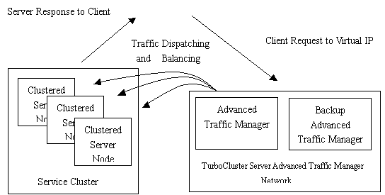 当客户向集群系统发送一个请求时,该请求首先到达高级流量管理器,高级流量管理器通过一定的调度策略将此请求转发到集群中的某一台实际服务器上对此请求进行处理,最终的回应请求将直接发送给客户。由于最终的回应请求没有通过高级浏览管理器而是直接发送给客户,这样大大减轻了高级浏览管理器上的负载,从而降低了瓶颈产生的可能。TurboCluster中采用的调度策略有:轮回(Round Robin)、加权轮回(Weighted Round Robin)、最少连接(Least Connection)。为了减少高级流量管理器产生失效的可能,TurboCluster为高级流量管理器准备了一个备份机。该备份机不断询问管理器来确认它正在正常工作,一旦发现主管理器已经失效,备份机将接替它继续工作。