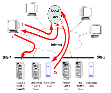 图5-1所示的分布式服务器包含两个集群,它们分别是site 1 和site 2。每个集群都包含着一台域名服务器和若干台运行web服务器软件的实际的服务器。当用户敲入一个域名时,首先在Local DNS上对这个域名进行解析,找出与其对应的IP地址。如果Local DNS无法对这个域名进行解析,就将此域名发送到Authoritative DNS上,Authoritative DNS返回应该访问的服务器的IP地址,然后用户就可以访问指定的服务器上的内容了。