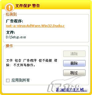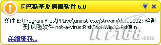 例:笔者在网上下载了某个汉化版软件,众所周知,目前国内许多汉化软件中都捆绑了 "流氓程序",现在它们在卡巴斯基的监控下变得无所遁形。这不,系统自动弹出警告提示:检测到广告程序,原来安装程序中加载有某大名鼎鼎的国产流氓程序,如图4。