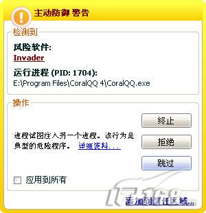 笔者启用"程序活动分析"后,上网短短的二十几分钟,遇到了不下三十次的警告提示。例:运行著名的QQ珊瑚虫版外挂,软件会提示一个危险的进程试图注入另外一个进程,如图11。