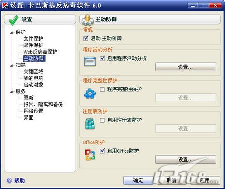 卡巴斯基的主动防御,简单说就是让电脑免受已知威胁和未知新威胁的感染,它主要由四个项目组成:程序活动分析、程序完整性保护、注册表防护、Office防护,如图9。