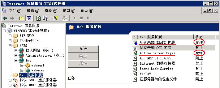 Web服务扩展需要开启ISAPI扩展和Active Server Pages许可。