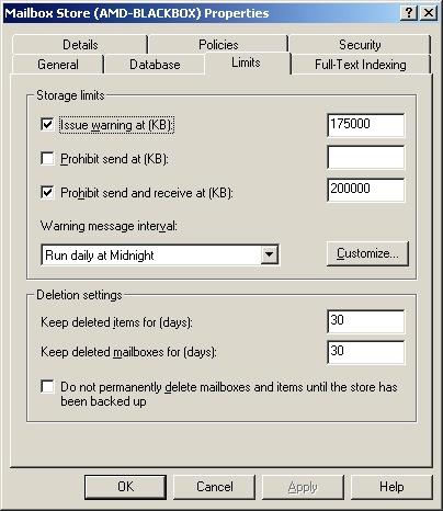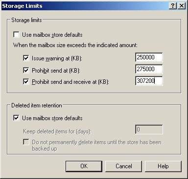 9.分别指定所希望的获得警告,禁止发送新邮件以及禁止发送和接受邮件的容量限制值。注意所有数值都必须以千字节形式输入(如,输入307200 KB表示设置的限制值是300KB)。