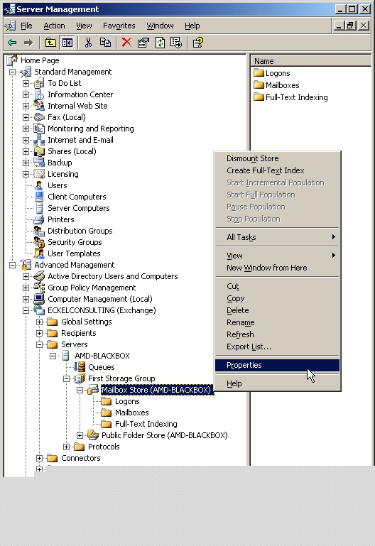 2.打开服务器管理控制台,按上述步骤进入邮箱存储(服务器名)属性框