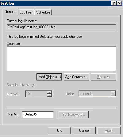 Windows NT Server 4.0 性能监视器 (Perfmon) 允许您一次将所有对象添加到监视器中。Windows 2000 Server 操作系统中未提供此功能,但是也存在一种解决办法,我们可以使用 Windows Server 2000 Resource Kit 中的 Perfmon4.exe 文件。Windows Server 2003 操作系统提供了此功能。在 Windows Server 2003 中,若要设置日志,可单击添加对象按钮。