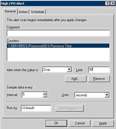 4. | 若要为警告定义备注,可添加计数器,添加阀值,然后添加采样间隔,并使用常规选项卡。下图展示了为某个值(此处为 CPU 利用率超过 90%)设置的警告。将每隔 5 秒钟检查一次 CPU 利用率,这里的 5 秒钟是默认设置。此时,该警告并未被记录。 ![]() |