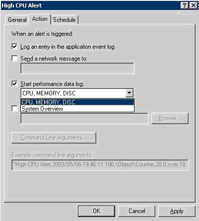 5. | 若要定义在计算机数据触发警告时采取的操作,可使用操作选项卡。在下图中,警告被设置为启动名为“CPU、MEMORY、DIS”的性能日志。这是先前创建的一个自定义性能日志的范例。 在前图中,请注意在触发警告时运行程序这个选项。使用此功能的一个例子是:您希望在 CPU 利用率峰值达到 100% 时运行 USERDUMP 或其他工具。 |
