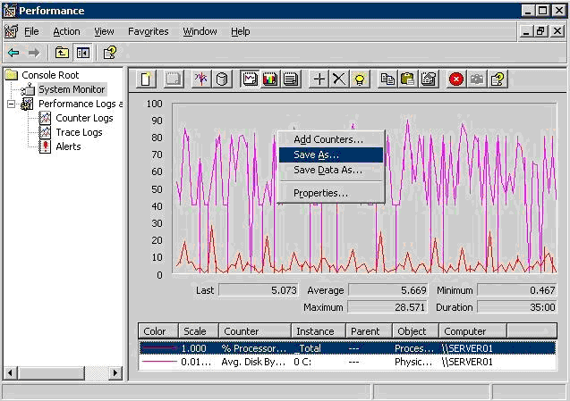 这样,便可将当前视图保存为 HTML 页面。现在,您可以将此页发送到其他计算机进行查看。为了正确打开此文件,您需要拥有从中获得数据的实际性能日志,而且该日志的保存位置必须与另存为 HTML 页面时所在的位置相同。该 HTML 页面通过一个 Microsoft ActiveX 控件来显示实际日志文件中的信息。可以在该 HTML 页面中查看 Perfmon 日志文件的位置和名称并对其进行修改。例如,如果您在记事本中打开该页面,可以搜索 LogFileName001(如果您当前只在查看一个日志文件)。如果需要,可修改日志文件的路径和名称。