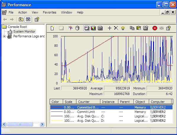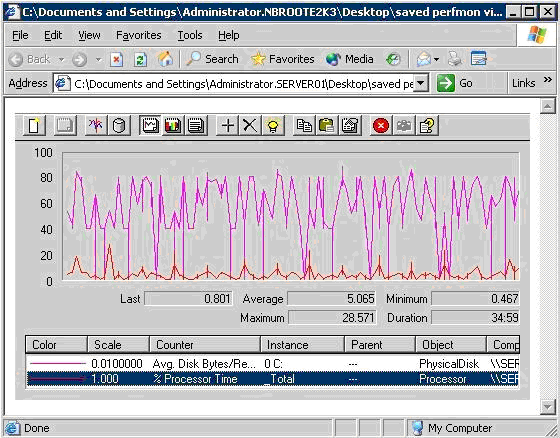 若要删除垂直线,可更改运行 Windows Server 2003 或 Windows XP 的服务器上的注册表项,提高包含大量信息的图形的可读性。更多相关信息,请参见微软知识库文章 283110:系统监视器工具中显示的垂直线让图形视图变得混乱." 下图显示了同一个图形在对注册表键进行更改后的样子。