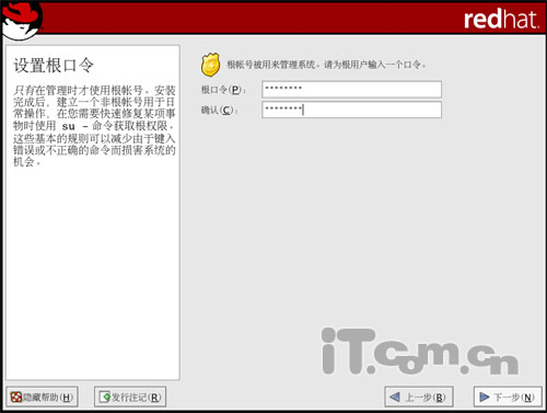 Red Hat Enterprise Linux 4.0系统的操级管理员Root密码设定,在这里,按照提示,连续输入二次Root的密码,按下一步继续安装。