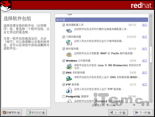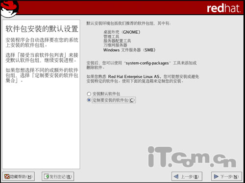 7、软件包安装选择,在这里提供有二个单选框:默认的软件包与定制安装的软件,如果你只需要尝试一下Linux,可直接选择默认的选择,单击下一步进行安装。也可以根据不同的应用,选择定制安装软件。如图12