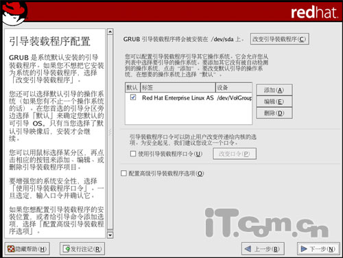 Red Hat Enterprise Linux 4.0 GRUB引导工具安装,在这里由于只安装一个系统,其选择只有默认的Redhat AS4启。单击下一步继续安装。图6