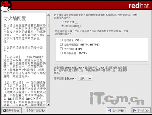 设置好网络之后,将会出现防火墙配置的对话框,在此建议初学者选择无防火墙,将有利于后期的调试与学习。