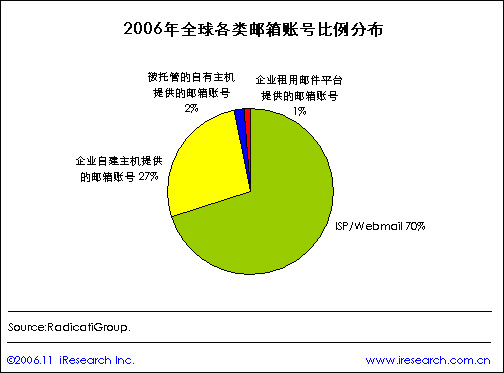 iResearch艾瑞市场咨询根据市场咨询公司RadicatiGroup公布的调查结果整理显示,在2006年全球电子邮箱账号中有70%是邮件服务提供商通过WEB页面提供的邮箱账号,有27%是企业自建主机提供的邮箱账号,2%的账号是由被托管的企业自有主机提供,另外的1%是企业租用邮件平台提供的邮箱账号,也就是像新浪、263等提供的企业邮箱服务。
