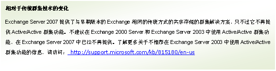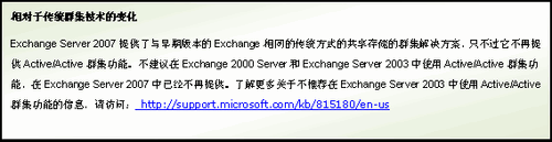 为带有群集功能的邮箱服务器提供冗余机制只是高可用性解决方案的一部分。Exchange Server 2007的其它角色不能安装在群集上,但是需要用多个服务器实现冗余。当您在为高可用性的要求设计您的Exchange Server 2007架构的时候,请确认在客户端、客户端邮箱和目录之间没有单一的故障点。