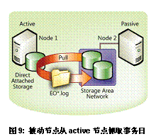 在主动节点,事务处理被写入到事务日志中。在当前事务日志写满时,被动节点从主动节点抓取事务日志的一份拷贝到被动节点。然后运行于被动节点上的服务把事务日志副本中的事务提交到被动节点的数据库中。